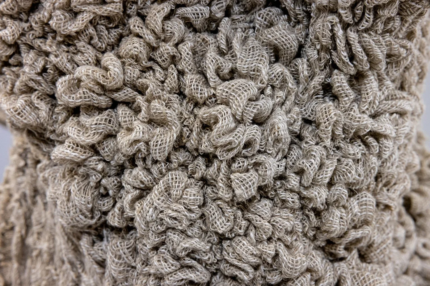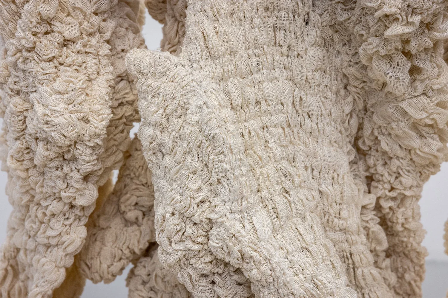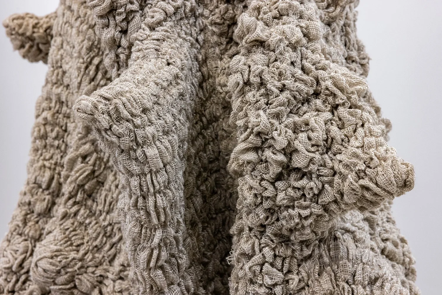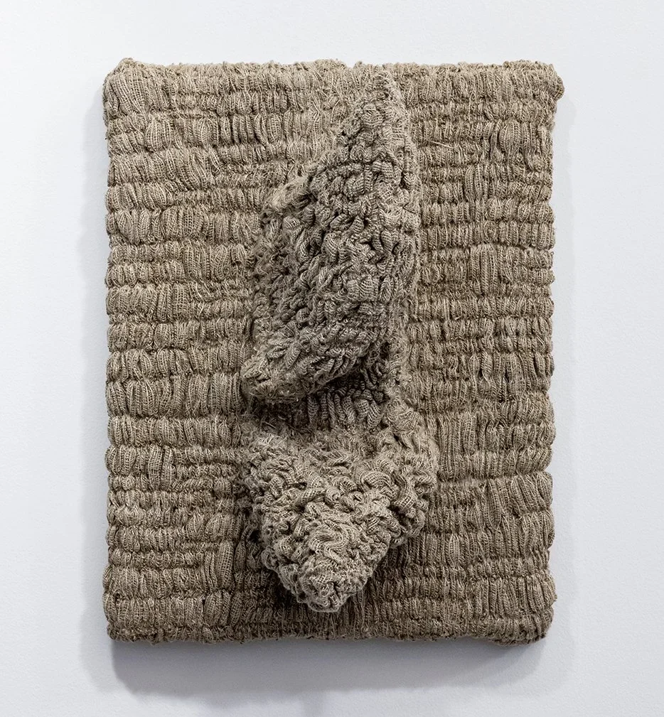 My most recent work expands on these themes through textural fiber sculptures, in which I meticulously pull thread by thread from linen fabric and sculpt the emerging textures onto mannequins. This meticulous process reflects the experience of undoing and reconfiguring identity, memory, and belonging. Deconstructing fabric—a material designed to hold and protect—becomes a simultaneous act of erasure and reconstruction, mirroring the fragmented experiences of migration and exile. Time is an essential element in this process. The repetitive, deliberate act of thread-pulling connects to the invisible histories of women’s labor, textile traditions, and resistance, embedding both physical effort and emotional weight into the sculpture. These forms exist in a state of transition, functioning as both sculptural objects and performative garments.